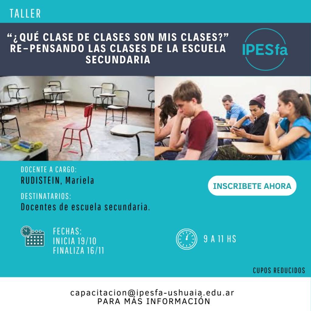 Taller: “Herramientas digitales para la gamificación en el aula” Taller: ¿Como hablamos con lxs chicxs? Encuentro intergeneracinales, repensando los dialogos entre adultxs, adolescentes y niñxs. Taller: ¿Qué clase de clases son mis clases? Re-pensando las clases de la escuela secundaria Textos perturbadores. La escuela como escenario de encuentro con las emociones Taller: CONCENTRAR Y EXTRAER La enseñanza de las causas estructurales del «maldesarrollo» argentino. Posts Navigation Página anterior 1 2 … 16 17 18 19 20 … 64 65 Página siguiente [/ wc_posts]